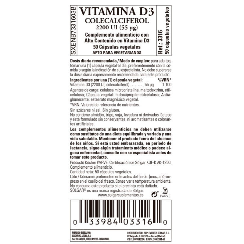 SOLGAR Vitamina D3 2200 UI (55 μg) (Colecalciferol) 50 Cápsulas Vegetales