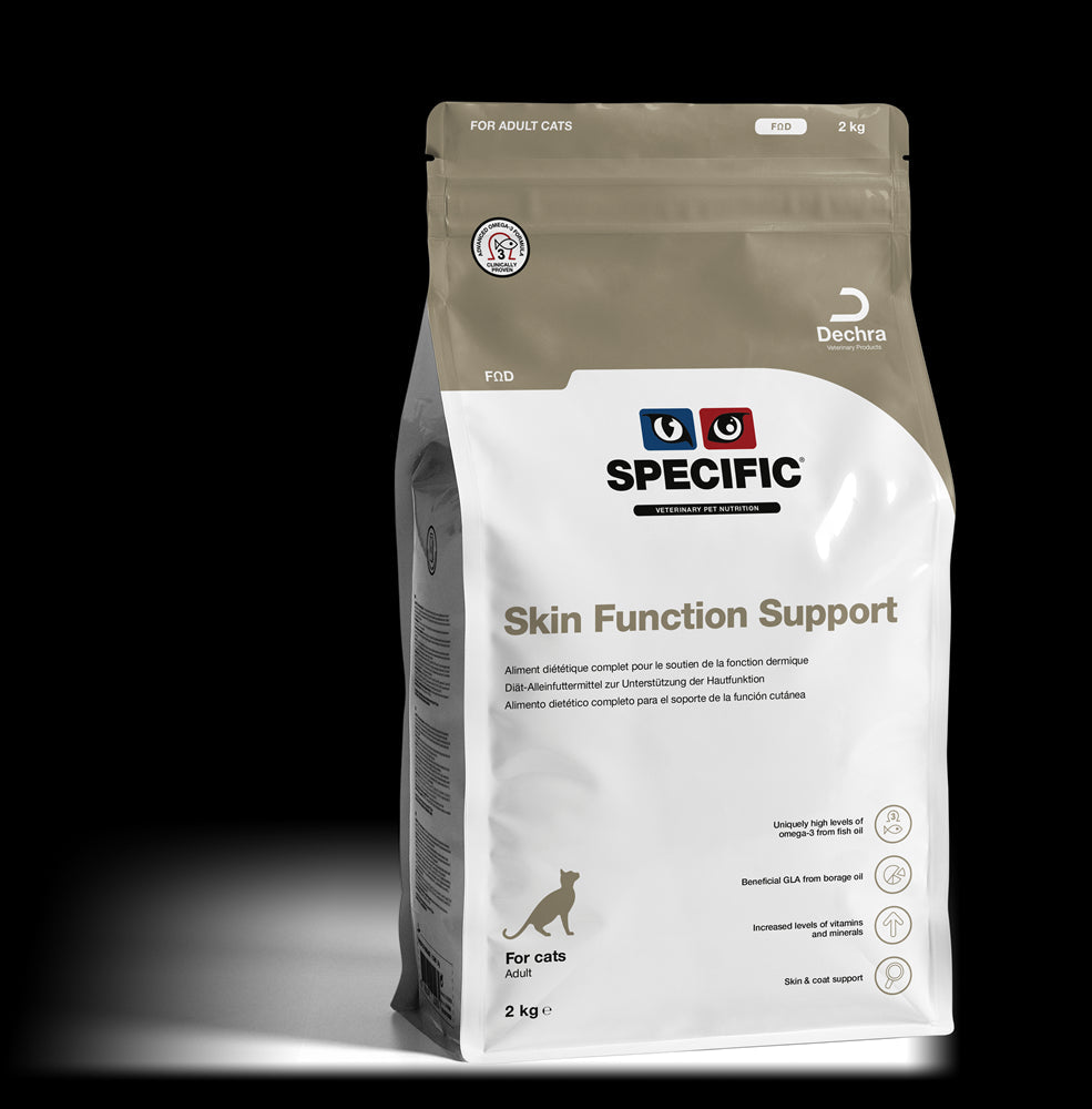 **Specific Feline Fod Skin Function Support 2000g** es un alimento seco premium, formulado para gatos adultos que necesitan apoyo especializado para su piel frente a alergias ambientales.