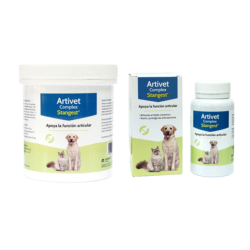 Stangest Artivet Complex es un condroprotector avanzado para perros y gatos que combina 8 ingredientes clave, incluyendo glucosamina y condroitín sulfato.