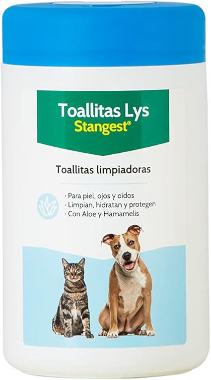 Cada paquete contiene 120 toallitas desechables impregnadas con una mezcla de agua de hamamelis y aloe vera, perfectas para limpiar los ojos y oídos de perros y gatos.