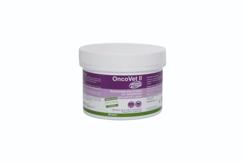Oncovet II de Stangest es un alimento complementario esencial para perros y gatos, formulado para fortalecer el sistema inmunitario y mejorar la calidad de vida durante tratamientos oncológicos.