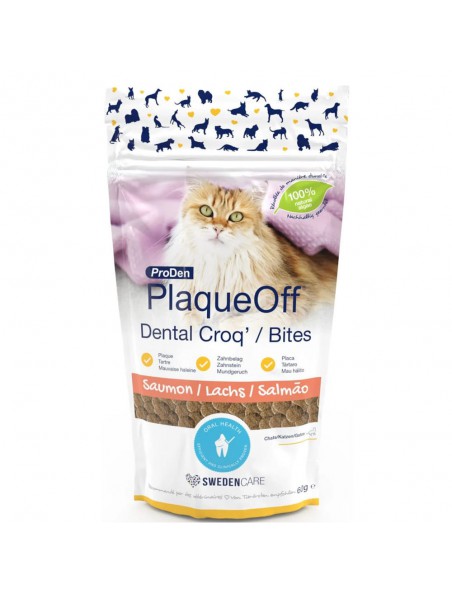 Swedencare Plaqueoff Dental Croq. Gato Salmón 60g es un excelente complemento para la higiene dental de tu gato.