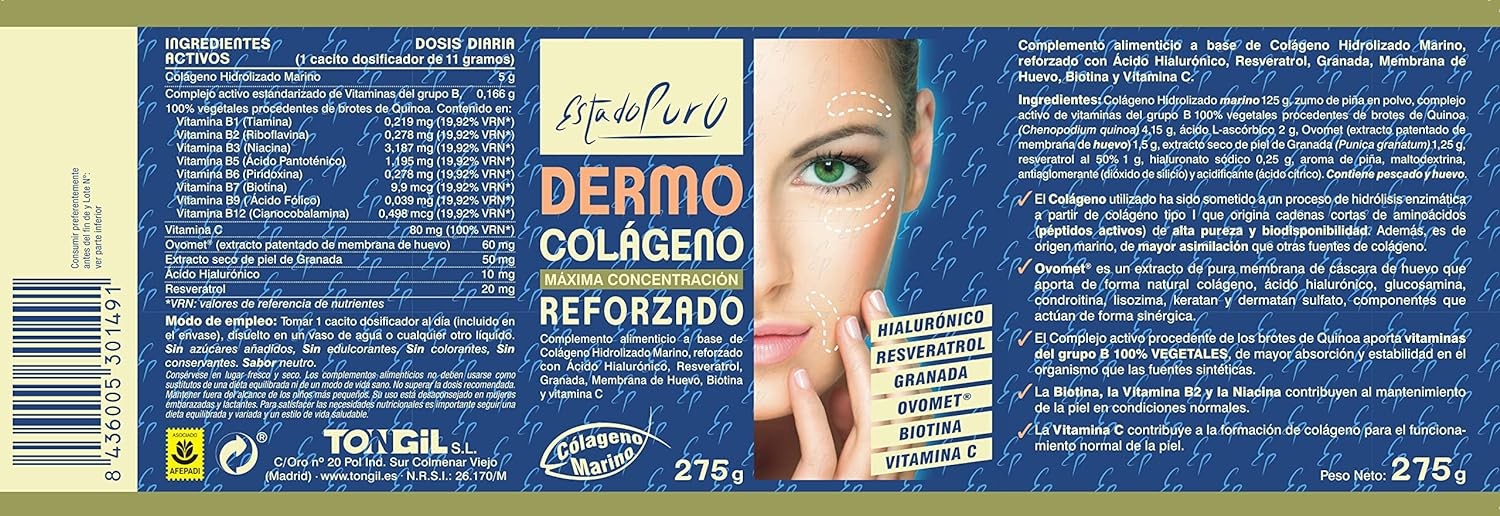 Tongil Estado Puro DermoColágeno 275 Gr. Colágeno hidrolizado marino, vitaminas del grupo B, ácido ascórbico, Ovomet, extracto de piel de granada, resveratrol y ácido hialurónico. Mejora el cuidado de la piel.