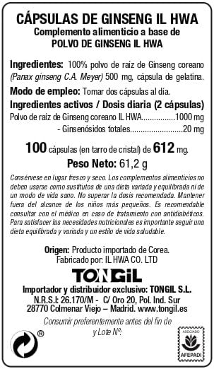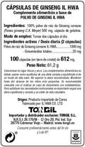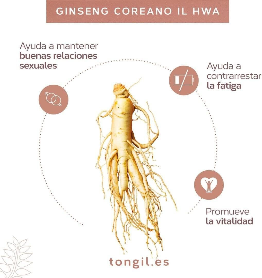 Tongil Ginseng Tarro 100 Cápsulas Il Hwa, con polvo de raíz de ginseng coreano IL HWA. Ideal para mejorar la vitalidad y el bienestar.