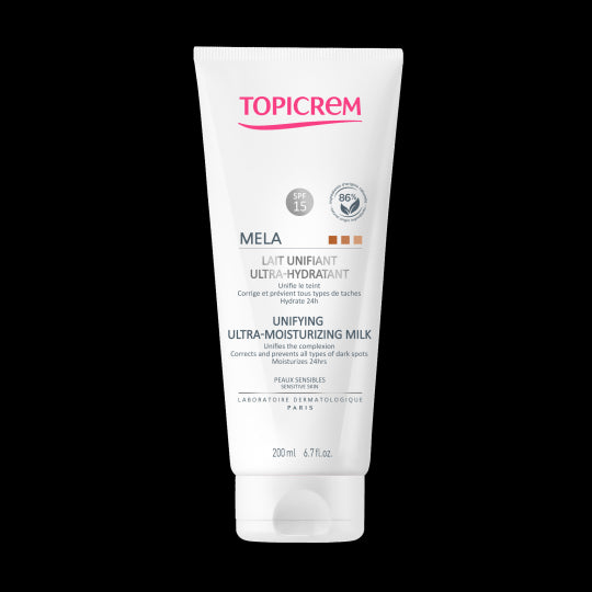 Descubre la Topicrem Mela Leche Unificadora Ultra-Hidratante Corporal SPF15+ 200ml, ideal para pieles sensibles.