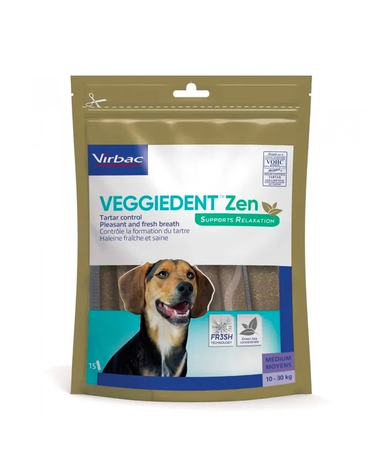 Las barras VeggieDent Zen de Virbac son golosinas masticables ideadas específicamente para perros de entre 10 y 30 kg.
