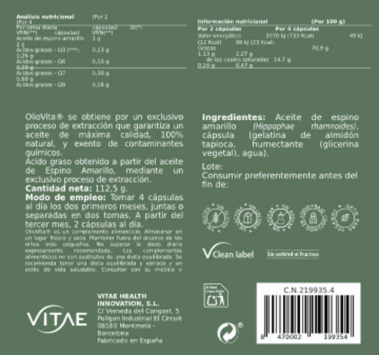 Vitae Oliovita es un complemento alimenticio en cápsulas de aceite de espino amarillo, rico en Omega 7, 3, 6 y 9.