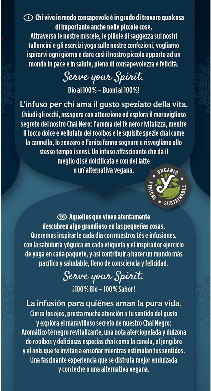 Descubre Yogi Tea Chai Negro, una infusión ayurvédica con té negro revitalizante, especias chai y rooibos dulce. Producto bio y vegano.