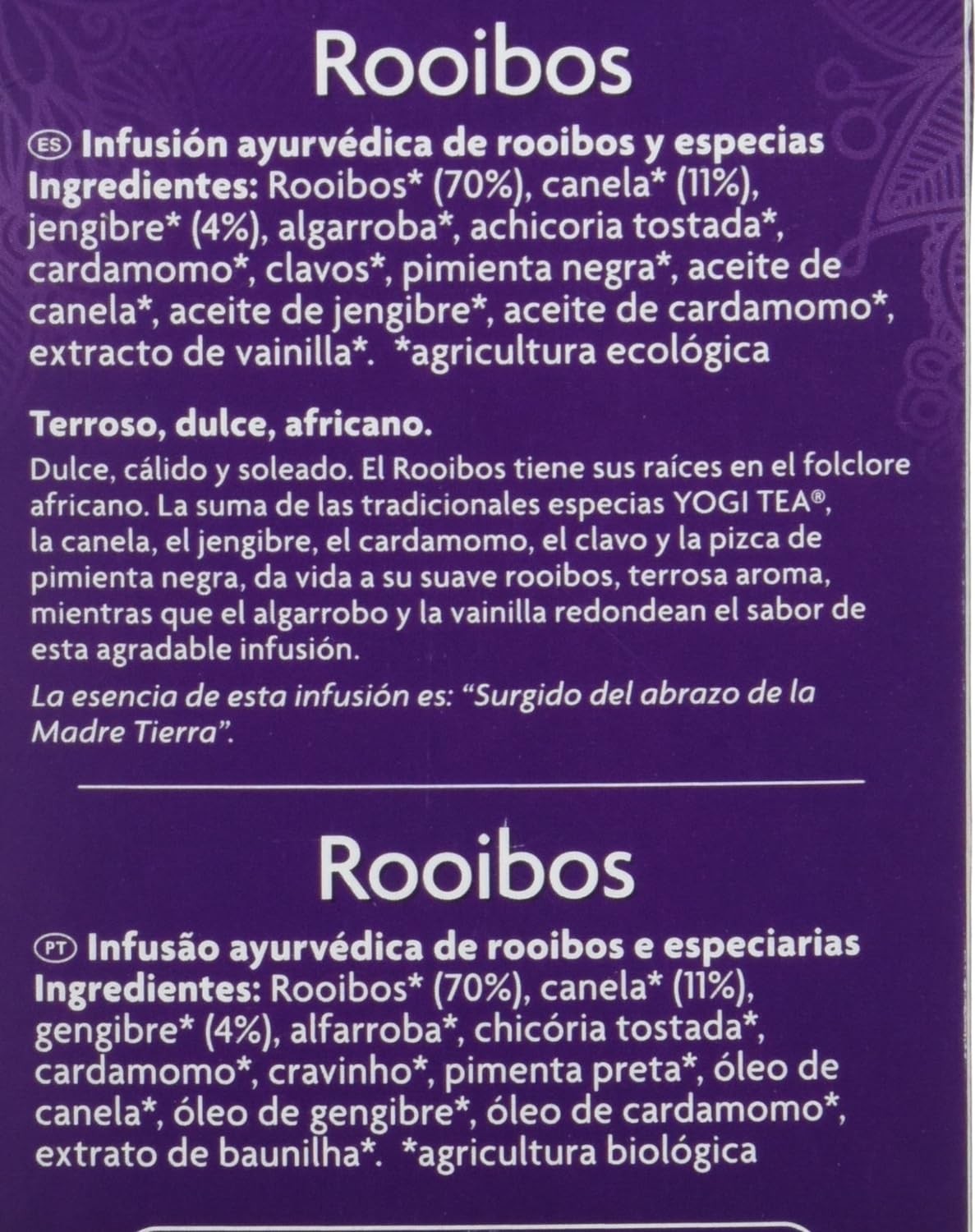 Yogi Tea Rooibos: Mezcla única de hierbas y especias que estimula la vitalidad y la alegría de vivir. Con ingredientes como rooibos, canela, jengibre y cardamomo. ¡Disfruta de su sabor incomparable!
