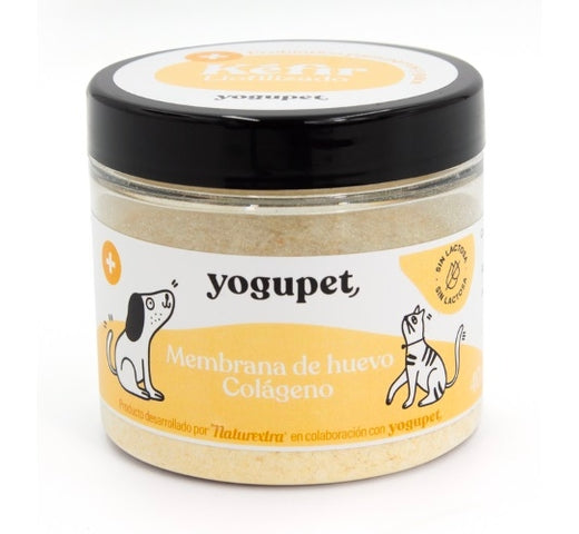 Yogupet Kéfir Liofilizado con Huevo y Colágeno es un complemento alimenticio en polvo de 40 g, diseñado para potenciar la salud de perros y gatos.